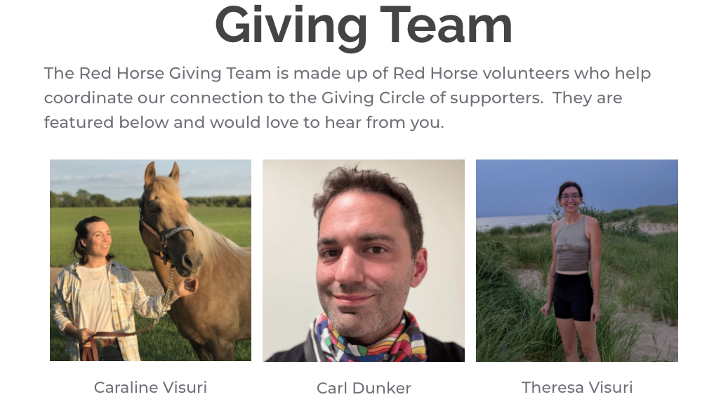 What does this mean for you? Our goal is to provide a connection to our most central supporters and a warm invitation to those who'd like to learn more and find out how they can participate. We hope to complement our digital outreach with human interaction and conversation. You might hear from one of them, reaching out to say thanks, invite you to coffee, or a Red Horse event. If you have questions or ideas about anything Red Horse, but especially related to Support Drives and all-things Giving Circle, you can reach out and start a conversation. Of course, Fred, Ulla, and Jenny are always on hand if you want a deeper dive into services, but the Giving Team is there to nurture and grow the giving circle with community and relationships in mind. As they say, we are more together.